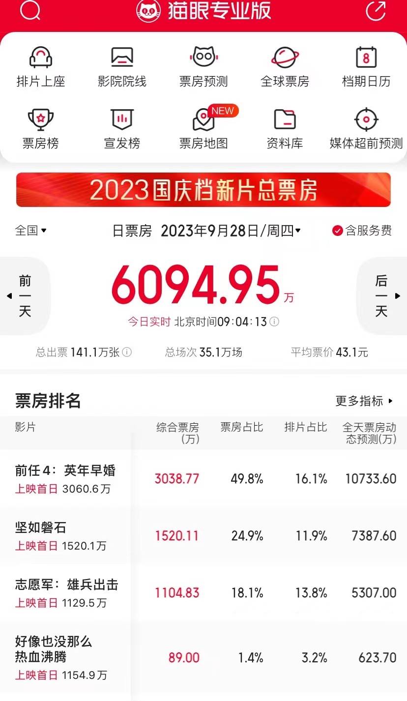 国庆档已经拉开序幕,目前有四部大片在28日上映,包括《前任4》《坚如磐石》《志愿军:雄兵出击》《好像也没那么热血沸腾》。