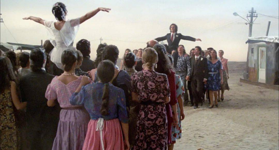 影片《血婚》改编自费德里科·加西亚·洛尔卡的同名话剧,话剧曾在西班牙享有盛誉。绍拉导演的电影改编并非照搬式地对舞台剧进行完全纪录,他发挥摄影机的可能性,通过场面调度与景别变化,强化着表演的节奏与情节的张力。同时,他也开始探索台前与幕后的互文关系,尽可能保留原著的故事精髓,并着力突出弗拉门戈音乐、舞步与肢体的力量。