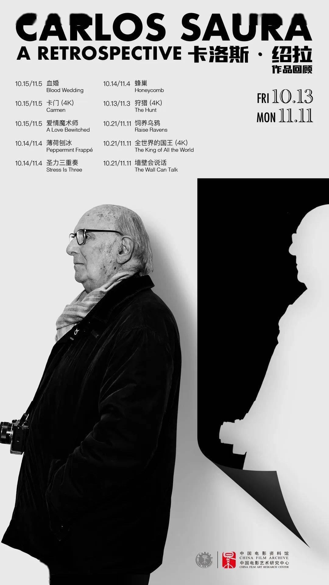 10月13日-11月11日,为缅怀与纪念这位西班牙大师电影作者,中国电影资料馆艺术影院特策划举办“卡洛斯·绍拉作品回顾”,将为观众朋友们带来10部卡洛斯·绍拉导演佳作的展映。本次展映的10部作品,包含9部剧情长片和1部纪录长片。它们之中有绍拉导演早期的成名之作《狩猎》,也有他在国际电影节赢得大奖、享誉影坛的重要影片《饲养乌鸦》。有为影迷所熟悉的“超现实主义三部曲”《薄荷刨冰》《圣力三重奏》《蜂巢》和“弗拉门戈电影三部曲”《血婚》《卡门》《爱情魔术师》,更有导演在2021-2022年创作的最后电影遗产《全世界的国王》《墙壁会说话》。其中,影片《狩猎》《卡门》《全世界的国王》放映的版本为4K版本。