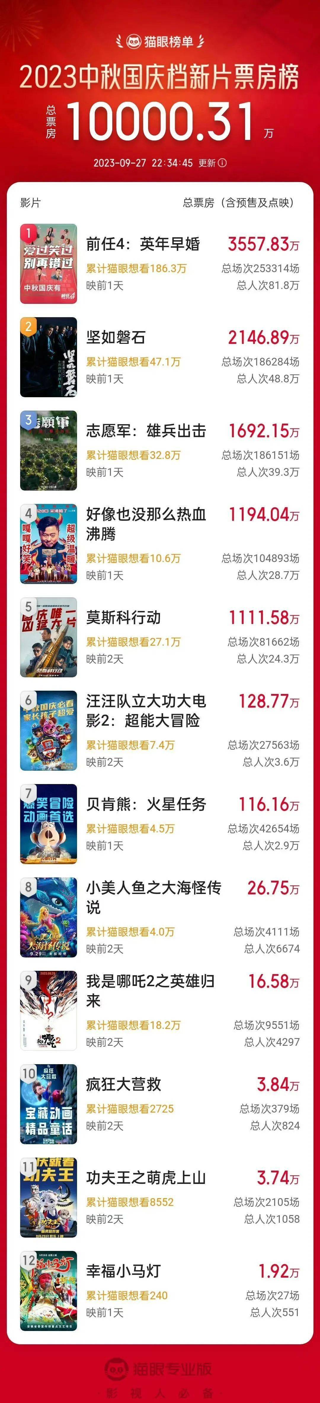 据猫眼专业版数据,截至9月27日22时34分,2023中秋国庆档新片预售总票房(含点映)破亿。《前任4:英年早婚》《坚如磐石》《志愿军:雄兵出击》暂列新片预售票房榜前三位。