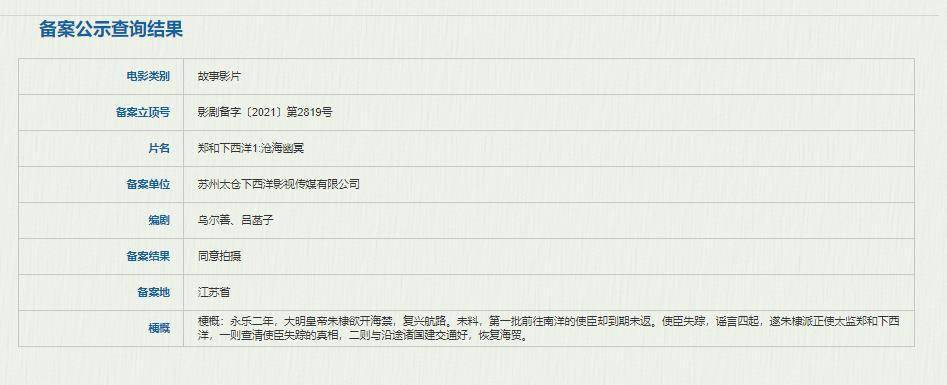 据国家电影局备案公示查询显示,电影《郑和下西洋1:沧海幽冥》已经正式立案备项,电影编剧为乌尔善、吕菡子,备案单位为苏州太仓下西洋影视传媒有限公司。