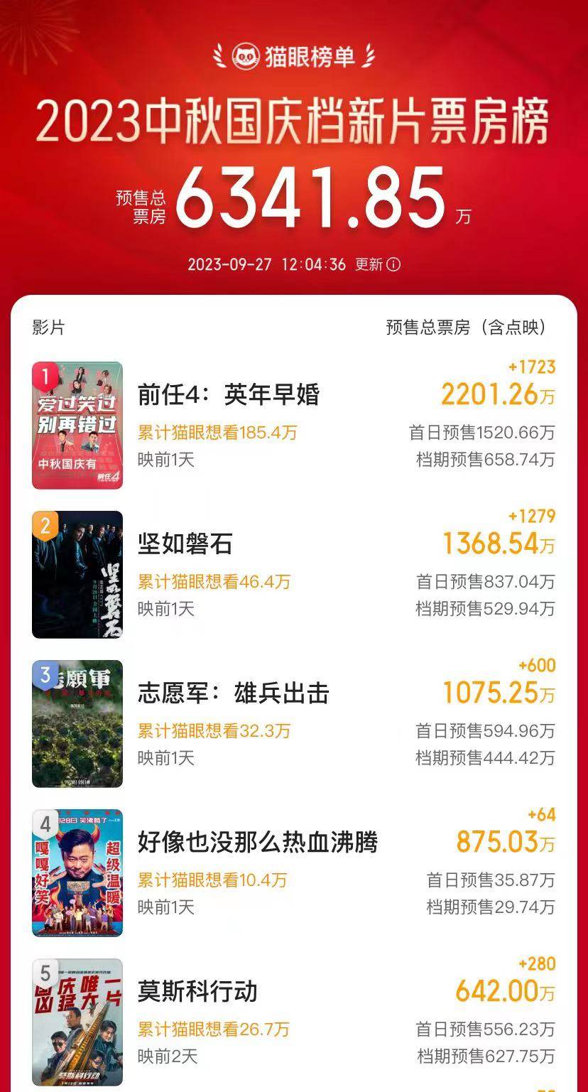 目前预售票房排前五名的分别是《前任4》《坚如磐石》《志愿军》《好像也没那么热血沸腾》《莫斯科行动》等。