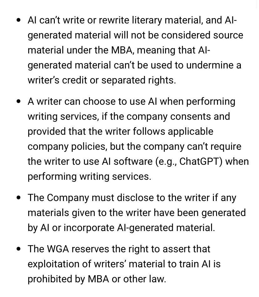 - 制片方必须向编剧披露,交给他们的任何素材是否由人工智能生成或包含人工智能生成的素材。