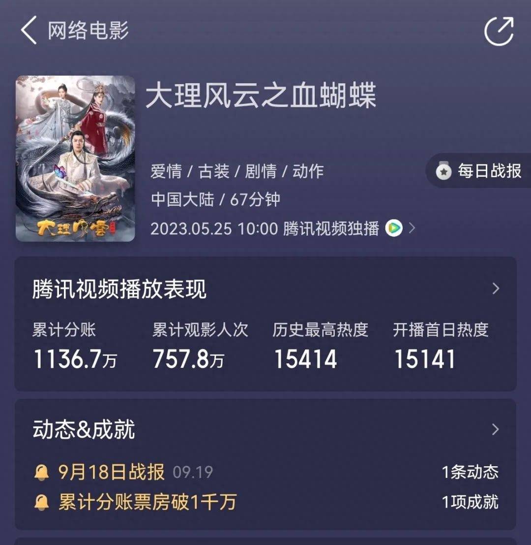 5月25日上线腾讯视频独播的《大理风云之血蝴蝶》(后简称《血蝴蝶》),是一个典型的通过投流实现票房翻身、生命周期延续的案例。