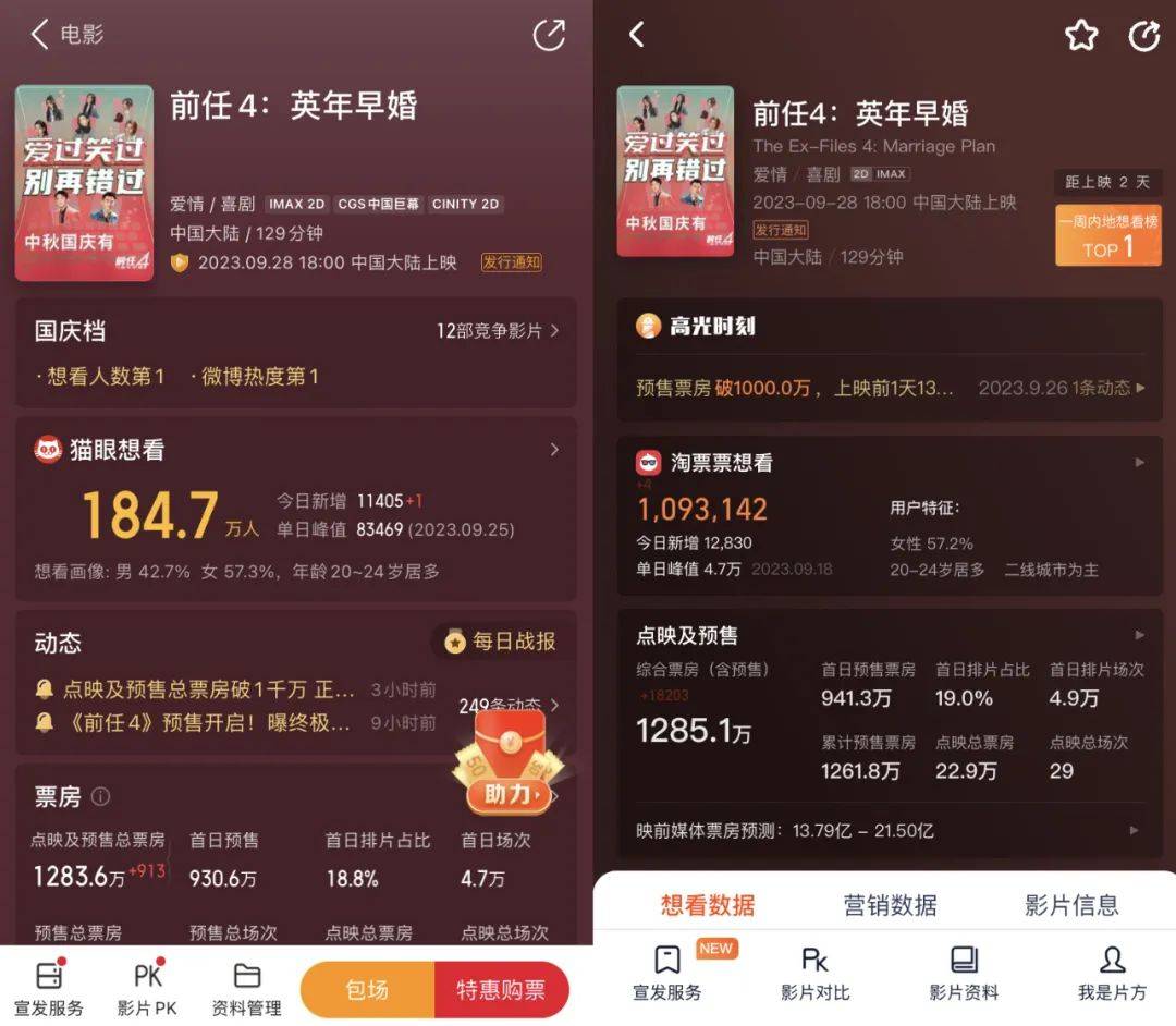 最新一部《前任4》不像是个娱乐片,甚至更像现实题材,真正聚焦于婚姻与爱情,各个角色都有了真正的结局,同时也伴随着各种强大的情绪、回忆杀,注定会让大量年轻观众哭晕一片。相对不错的品质,配上顶级的热度,《前任4》有望拿到一个前作的基本盘。