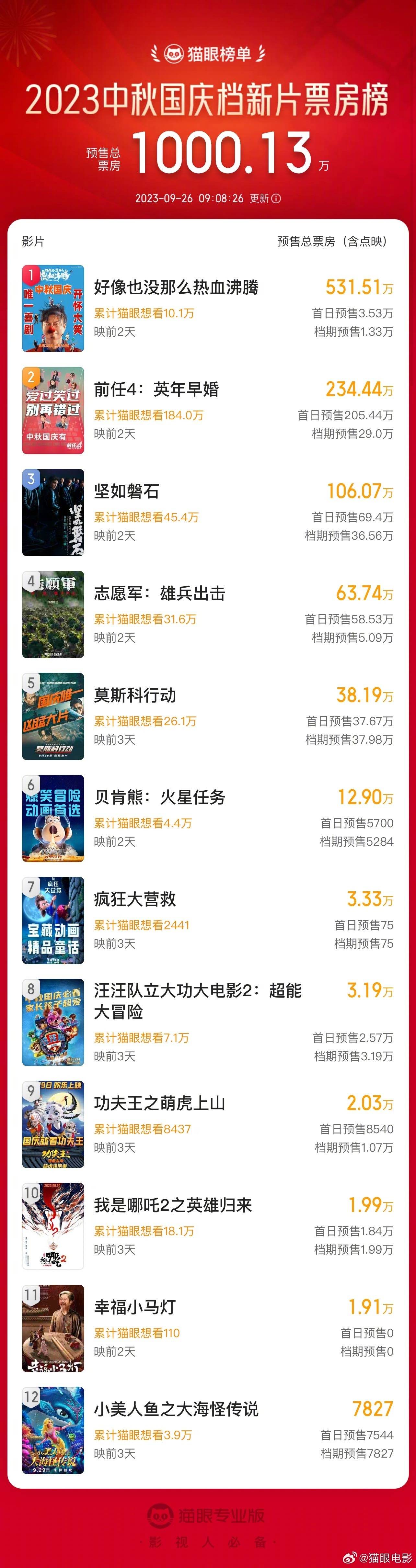 据猫眼专业版数据,截至9月26日09时08分,2023年中秋国庆档(9月29日-10月6日)新片预售总票房(含点映)破1000万,《好像也没那么热血沸腾》《前任4:英年早婚》《坚如磐石》暂列前三。