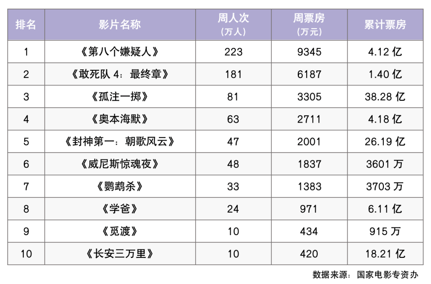 《第八个嫌疑人》以较大优势位列上周周榜冠军,获得9345万,占据上周票房的三成,目前该片累计票房已达4.12亿。影片已连续三周获得周票房榜冠军。