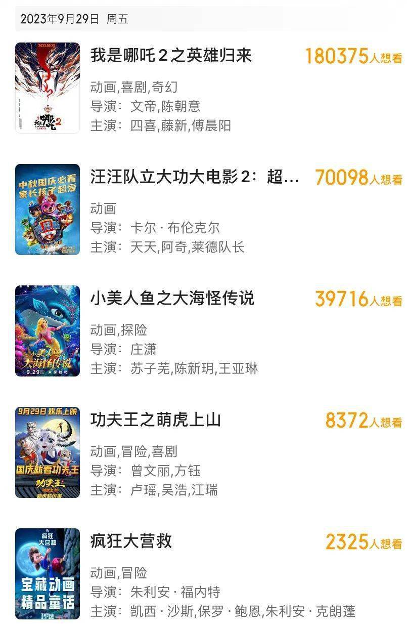 十一部电影集结,2023国庆档已蓄势待发。一众新片当中,谁最受观众青睐?带着这份好奇,我们查询了售票平台的映前“想看”指数,发现除了几部群星云集的“头部”,有一部动画电影意外表现得很突出——