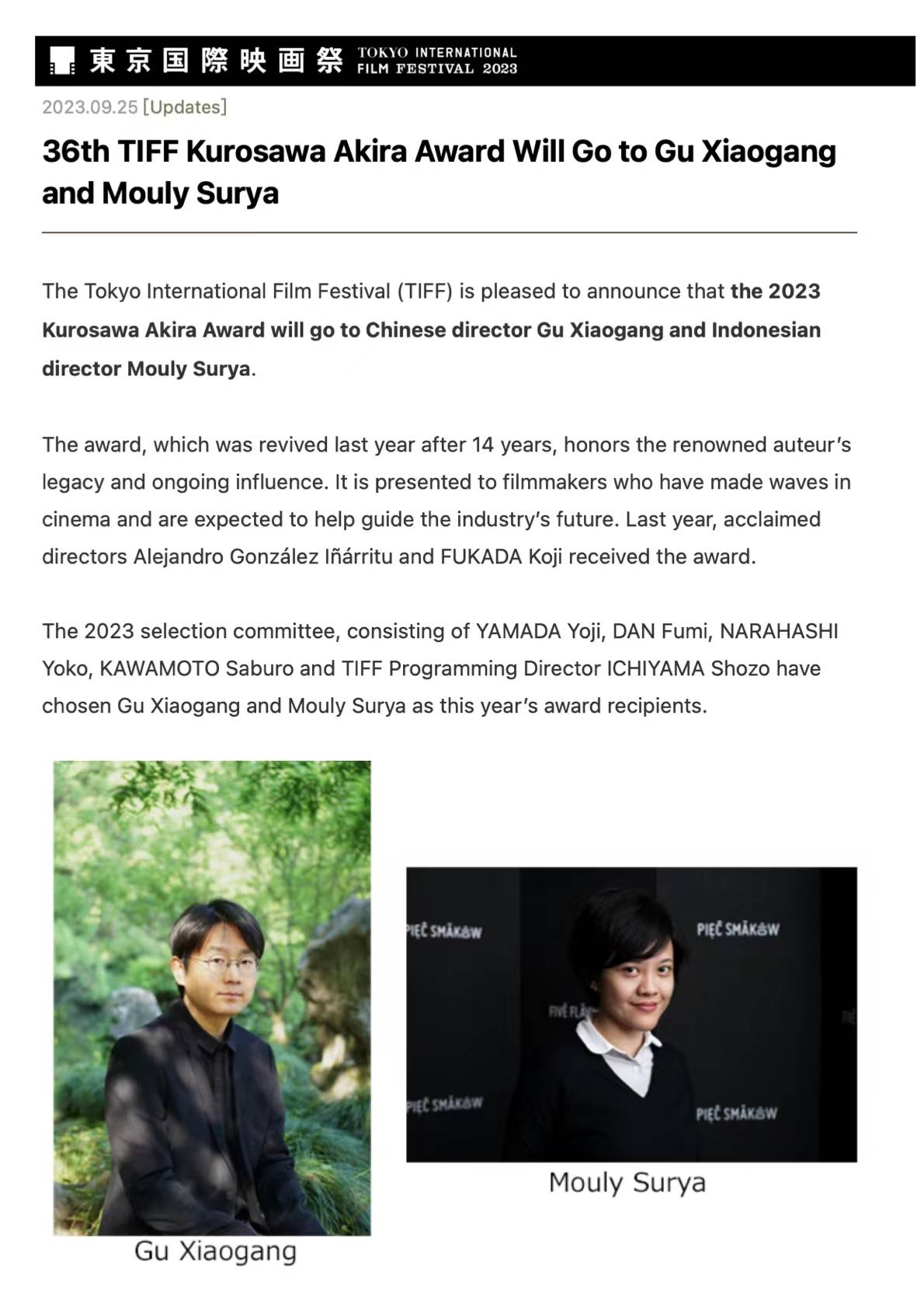 搜狐娱乐讯 (哈麦/文)9月25日,第36届东京国际电影节(TIFF)正式宣布,中国导演顾晓刚被授予2023年度“黑泽明奖”(Kurosawa Akira Award)特别荣誉。这也成为继侯孝贤及陈凯歌之后,第三位摘得此国际奖项的华语导演。顾晓刚也成为东京国际电影节“黑泽明奖”历史上,最年轻的获得者。他以其独树一帜的山水叙事设计,细腻的人文眷注及创作洞察,使中国东方诗意的影像美学,于国际电影业界,备受瞩目。