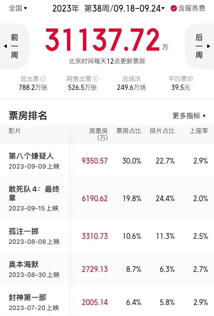 原标题:9.18-9.24内地一周票房报收3.11亿 《第八个嫌疑人》9350万三连冠累计4.11亿