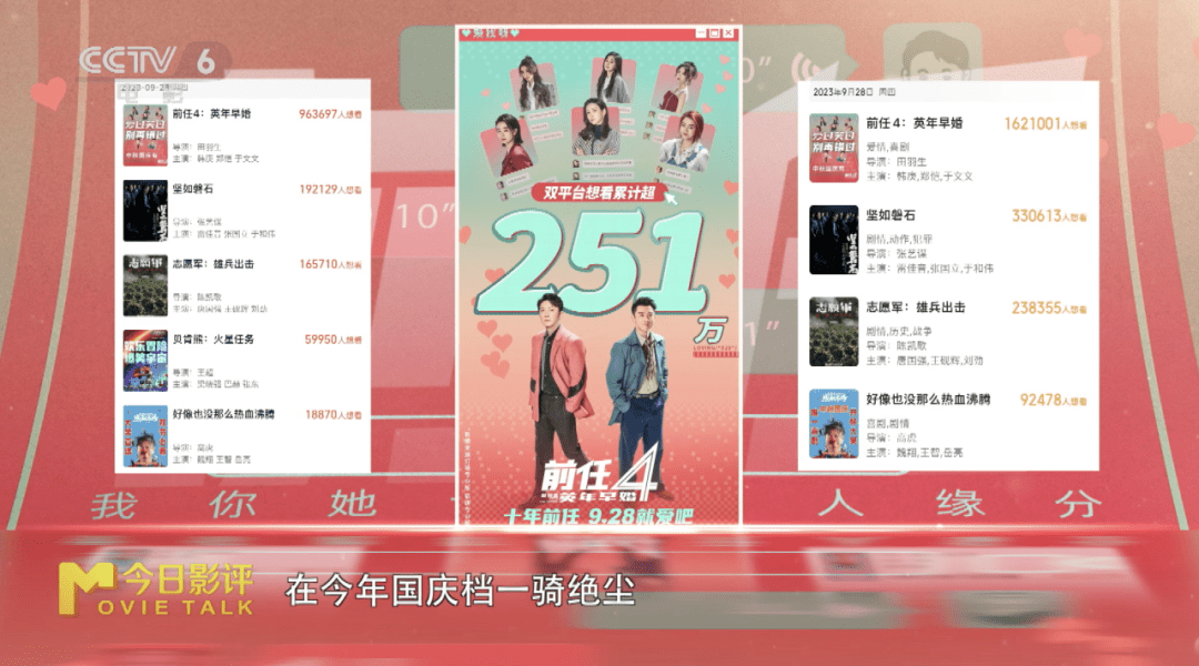 “成熟IP”、“原班人马”、“爱情喜剧”,这些熟悉的配方竟让《前任4:英年早婚》在双平台想看人数以超200万姿态,在今年国庆档一骑绝尘。