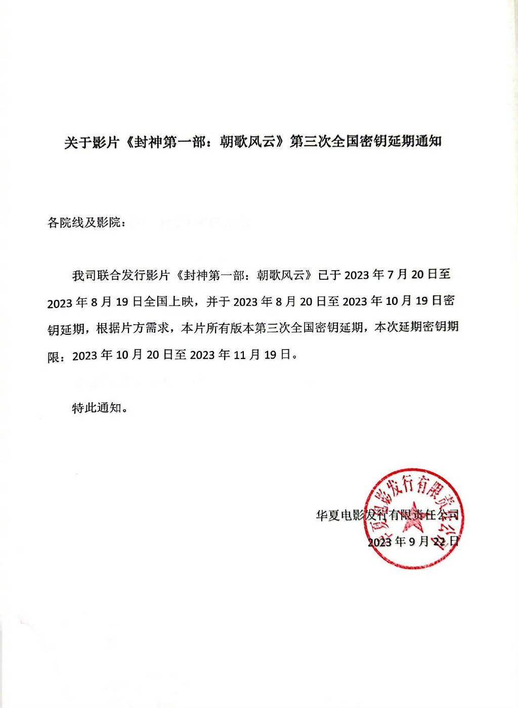 原标题:电影《封神第一部》密钥三次延期 延长至11月19日