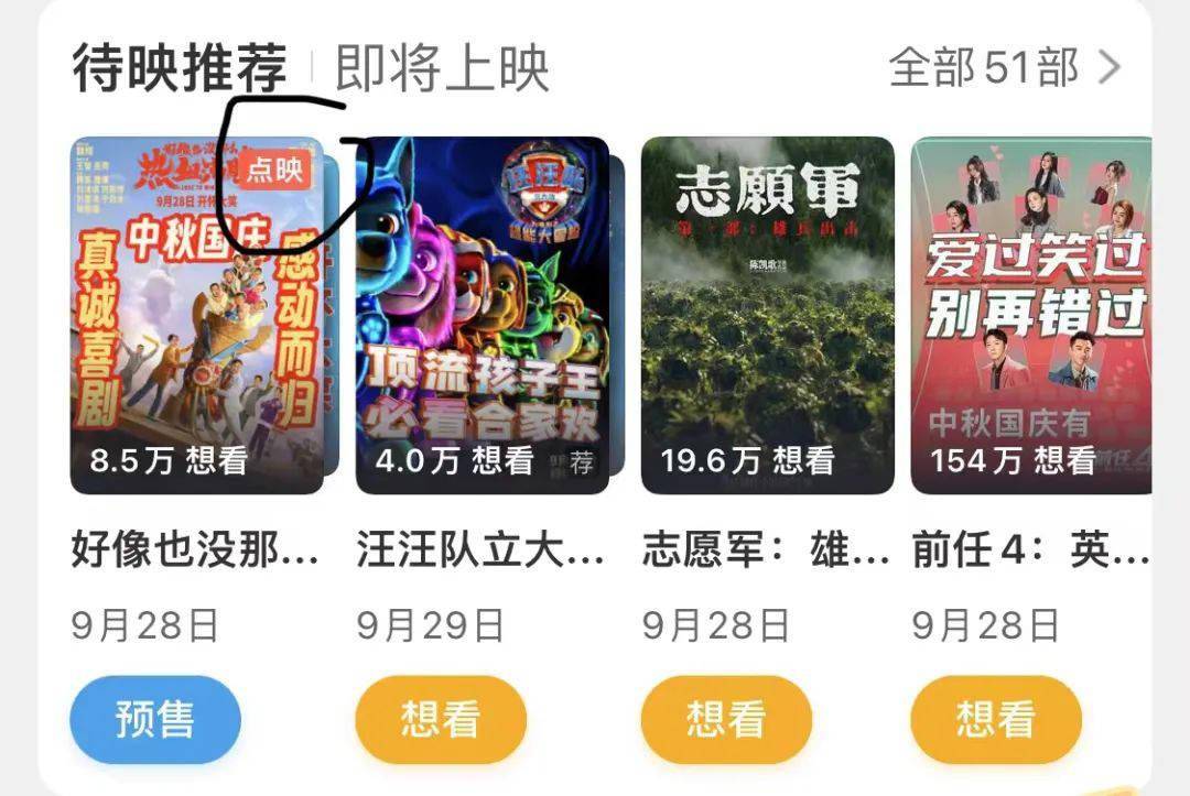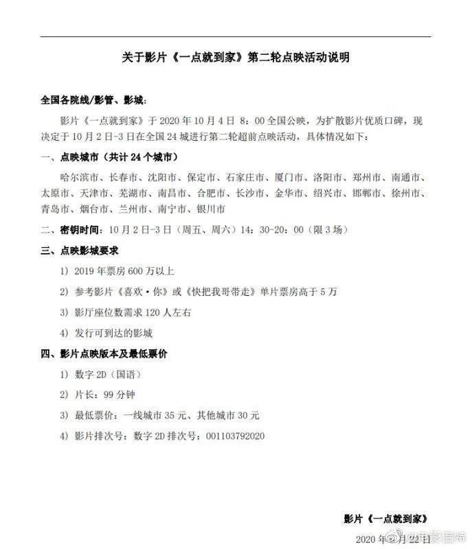 这次点映并没有像暑期档的那样,大面积的进行全国放映,而是选择在部分指定城市的部分影院,进行特定时间的单场放映。