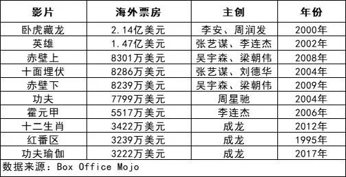 我们不完全统计了华语电影海外票房前十名,截至2023年,海外票房冠军位置仍然被李安导演2000 年执导的《卧虎藏龙》牢牢占据。而其余领跑影片也大多由张艺谋、吴宇森、成龙这类海外知名度较高的影人领衔。