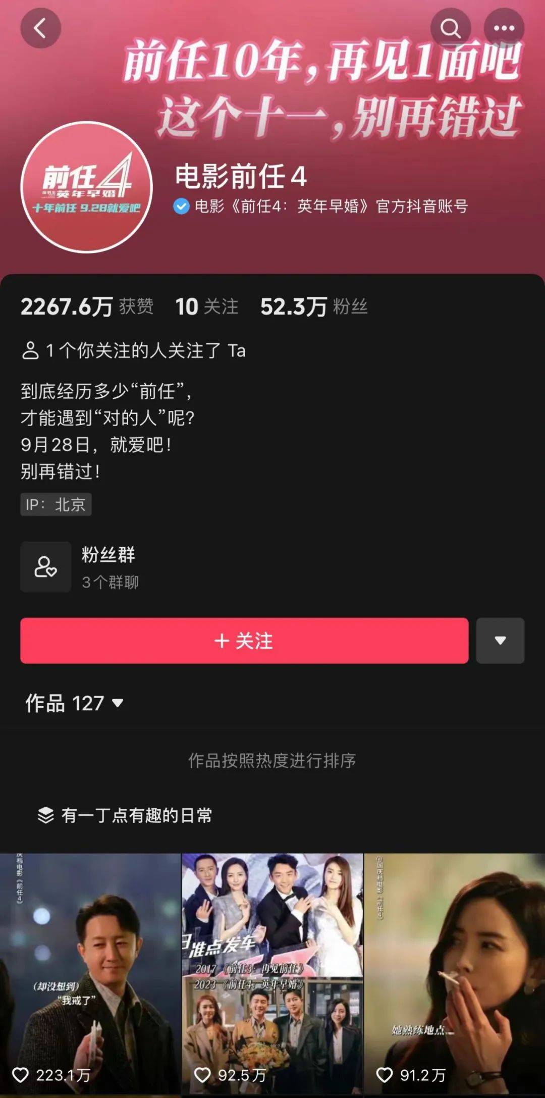 作为一部标准的大IP续作,《前任4》目前核心的宣发方案还是放大IP情怀,围绕着核心主创、影片金句去发掘热点。依托于稳固的基本盘,该片官抖的粉丝量和点赞量都在同期项目中遥遥领先,但落到爆款物料上,目前只有一则获得了百万级的点赞量。