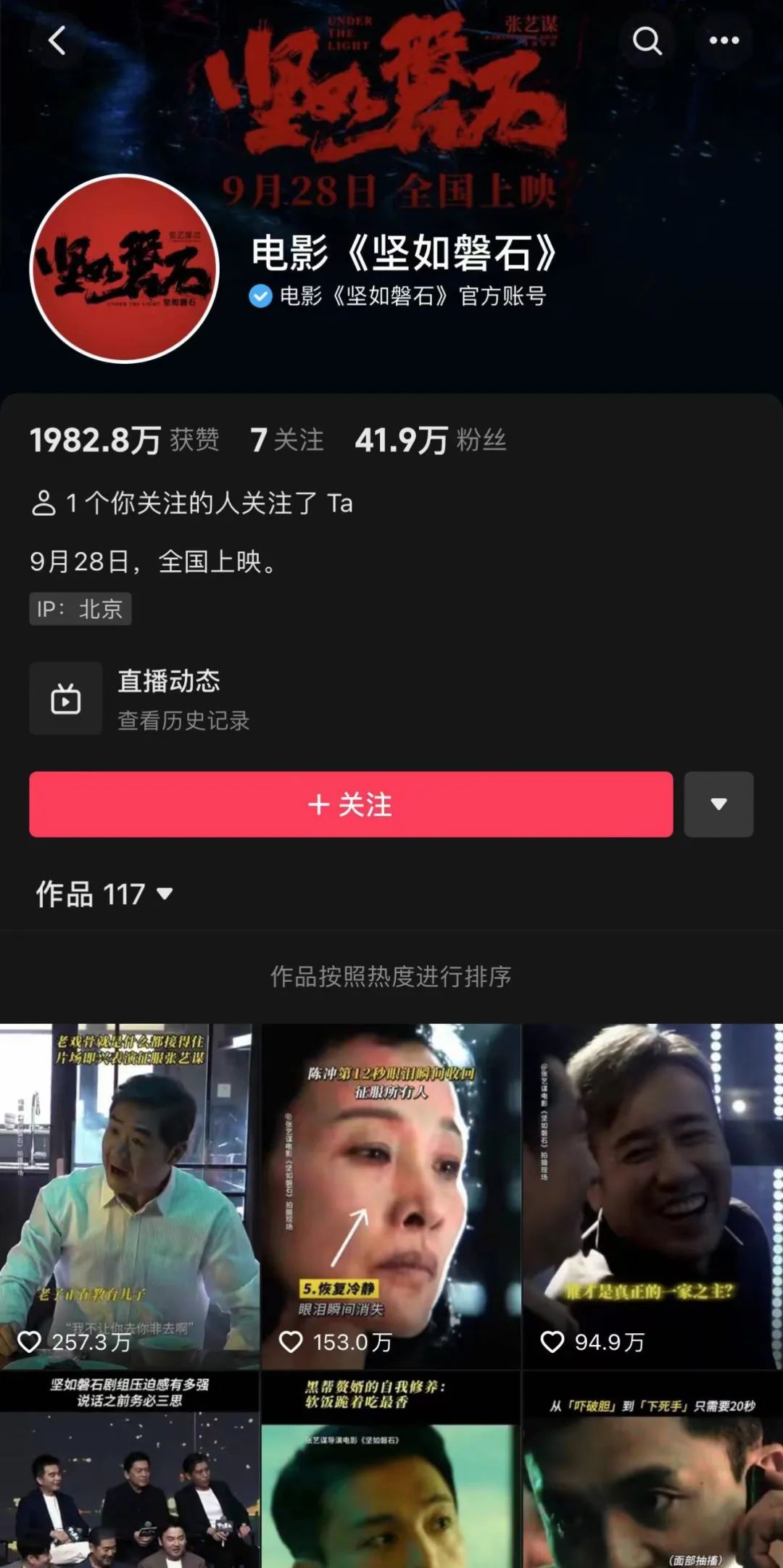 一个最直观的体现是,直至9月19日该片的官抖累计获赞不足千万,粉丝数不足十万,已发布的113个作品中仅有一则“心青年演员表演片段”点赞突破百万。