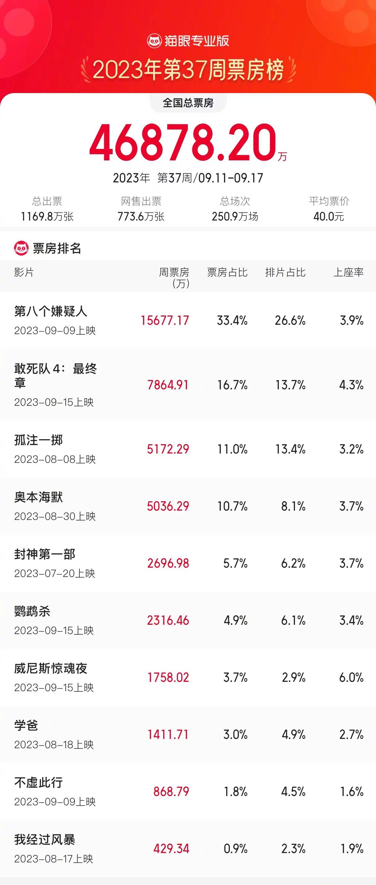 原标题:9.11-9.17内地一周票房4.68亿《第八个嫌疑人》1.56亿两连冠
