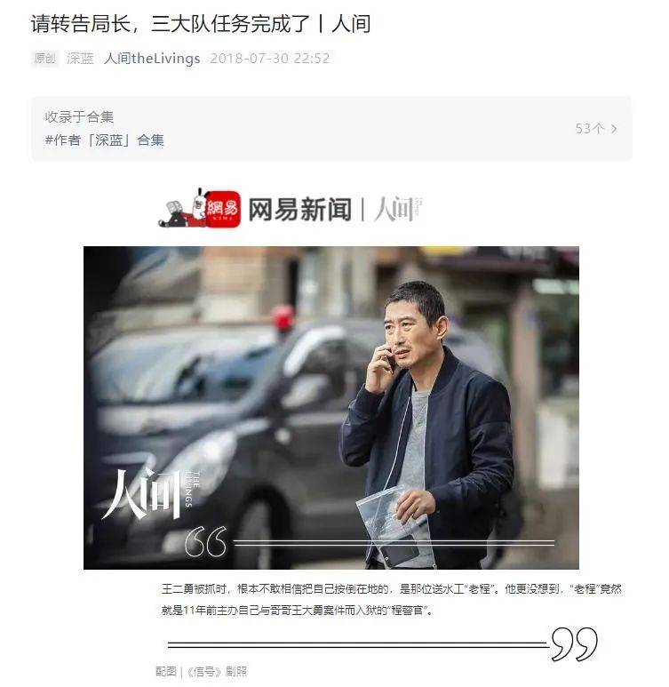这个故事最初于2018年载于“网易人间工作室”作者深蓝的 《请转告局长,三大队任务完成了》。文章登出后,由于故事之跌宕、主要人物程兵形象之深刻,立刻引发了全网热议,更一时上演了“万人血书求拍电影”的场面。这篇文章也在当年斩获了2018年网易文学年度点击冠军。