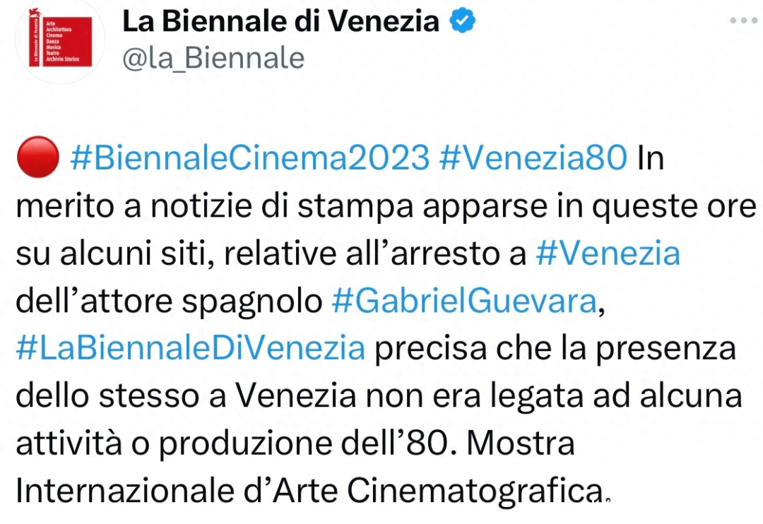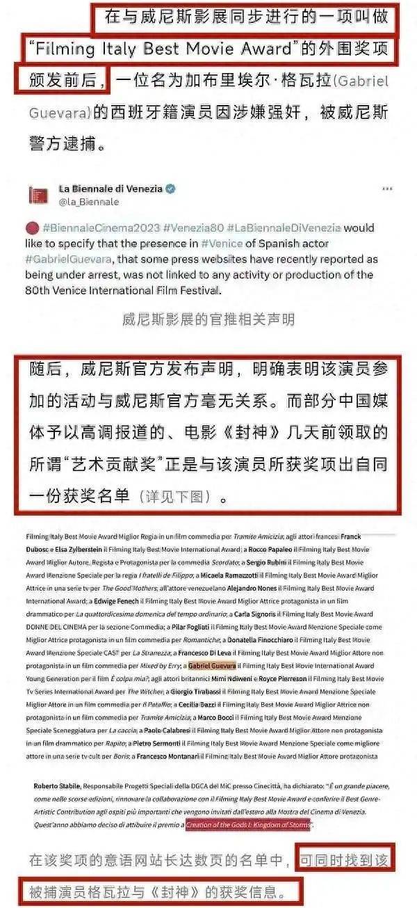 原来和《封神》剧组同时参与领奖的一个西班牙演员,因为在威尼斯涉嫌犯罪被抓了,吓得威尼斯电影节真正的主办方赶紧澄清表示,这个演员领的奖和威尼斯没有任何关系!