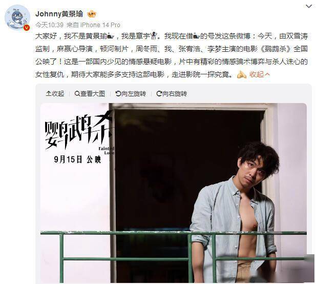 原标题:章宇“盗号”黄景瑜微博 热情宣传新片《鹦鹉杀》