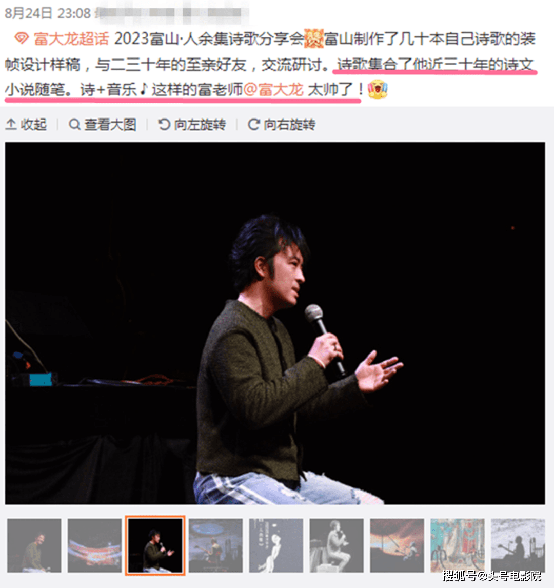 看现场照片,富大龙还弹奏了乐器,完全沉浸于自己的文艺世界里。