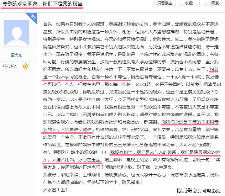 文中,富大龙强调,自己不认同“粉丝”这个概念,认为“它有一种不平等性”,“我拥有粉丝是对一个观众的不尊重,不尊重别人就是不尊重自己”。
