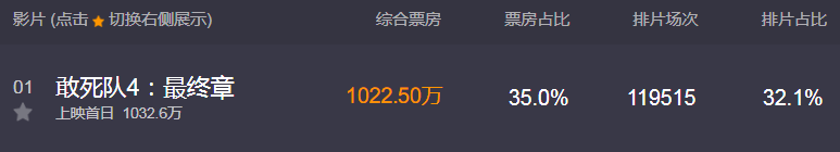 同一天,史泰龙、杰森·斯坦森等人主演的动作大片《敢死队4》上映,当天排片第一,达到32.1%。