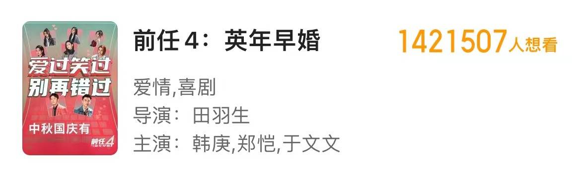 所以,即使品质上不会有质的提升,但由田羽生执导,韩庚、郑恺、于文文等原班人马主演的《前任4:英年早婚》,票房大概率不会差。
