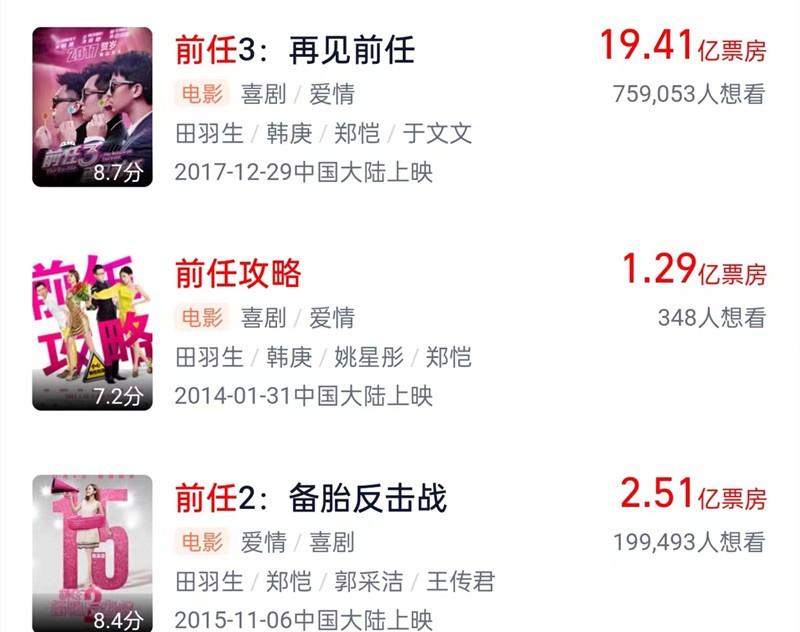 第一部卖了1.29亿,次年上映的第二部收获2.51亿。而2017年上映的《前任3:再见前任》,更是在满网吐槽声中狂卖19.41亿。