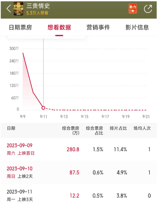 《三贵情史》上映的首日,有11%的排片,算是给够了新片上映的份额了,却只拿到了1.5%的票房,综合票房只有280万。