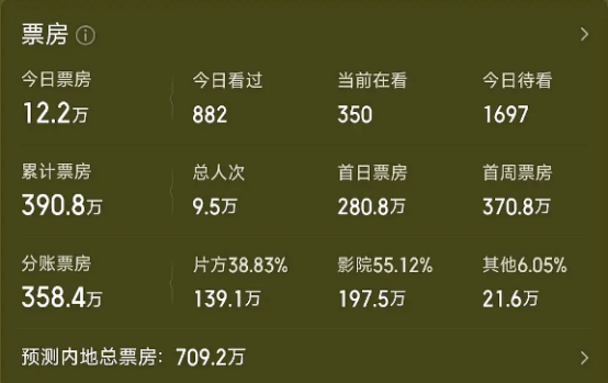 而后面几天,则是越跌越低,第三天的票房甚至只有12万了,预测票房也只有709万,主演全都有名有姓,票房居然还是只能拿几百万。