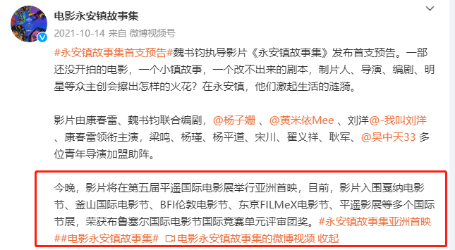 早在2021年宣传初期,《永安镇故事集》即开始提及影片曾入围戛纳电影节、釜山国际电影节、平遥影展等多个国际影展。