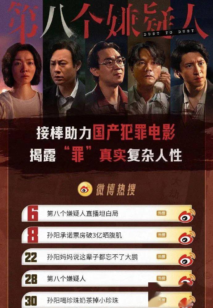 以改编自真实事件的《第八个嫌疑人》为例。该片主打“国产犯罪电影”的悬疑感和奇观性,且将近期人气正盛的孙阳作为重点宣传对象,影片多个出圈话题与孙阳有关。金爵奖主竞赛单元的光环和大鹏获评最佳男演员的话题流量相对逊色。