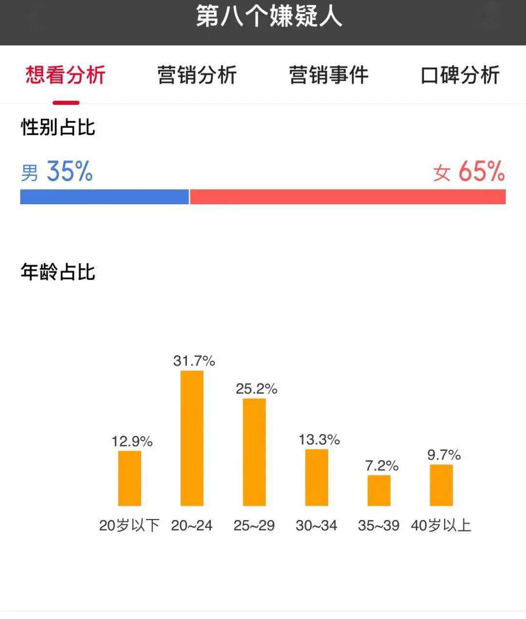 从受众画像上看,《第八个嫌疑人》受众65%为女性,且以20-25岁的女性居多,某种程度也说明了“孙阳女孩”之于影片票房的加持作用。外加题材和口碑优势,该片票房表现也得以遥遥领先同档对手。