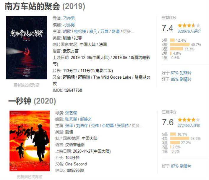 一个豆瓣7.4,一个豆瓣7.8,两者都是同档作品中的“口碑最佳”,这意味着,契合影展评委口味的同时,《南方车站的聚会》和《一秒钟》也切中了普罗大众的审美,因此在激烈的市场竞争中赢得一席之地。