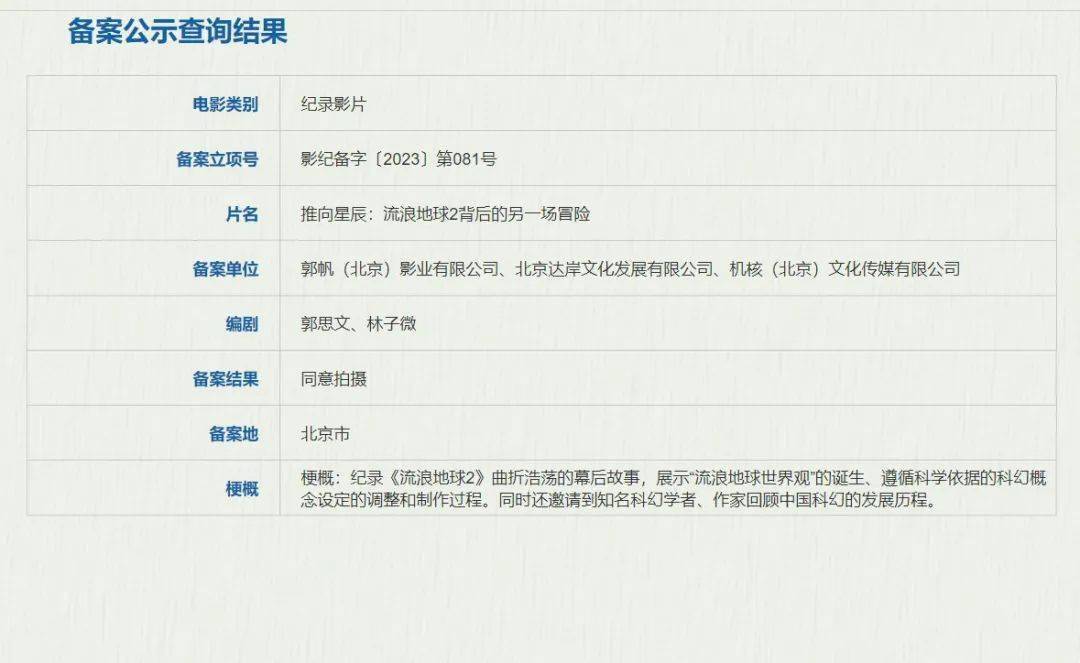 国家电影局2023年7月下全国电影剧本(梗概)备案、立项公示的通知,《推向星辰:流浪地球2背后的另一场冒险》正式立项。影片将纪录《流浪地球2》曲折浩荡的幕后故事,展示“流浪地球世界观”的诞生、遵循科学依据的科幻概念设定的调整和制作过程。同时还邀请到知名科幻学者、作家回顾中国科幻的发展历程。