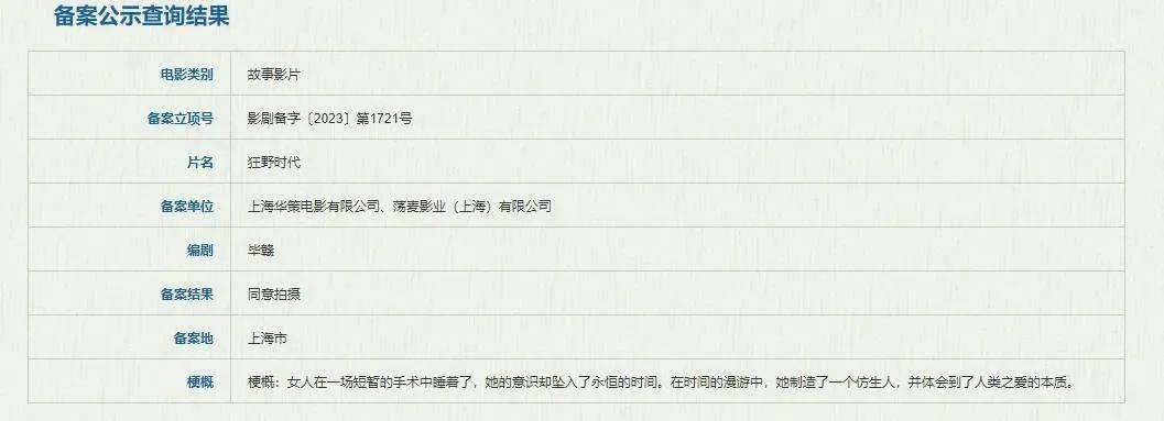 国家电影局发布关于2023年7月下全国电影剧本(梗概)备案、立项公示的通知。其中,由毕赣编剧的电影《狂野时代》正式立项,获准拍摄。根据官方发布的剧情梗概显示,影片讲述了女人在一场短暂的手术中睡着了,她的意识却坠入了永恒的时间。在时间的漫游中,她制造了一个仿生人,并体会到了人类之爱的本质。影片融合了超现实、侦探、科幻多种元素。此前,《狂野时代》发布概念海报,并宣布主演为易烊千玺和舒淇,目前影片正在筹备中。