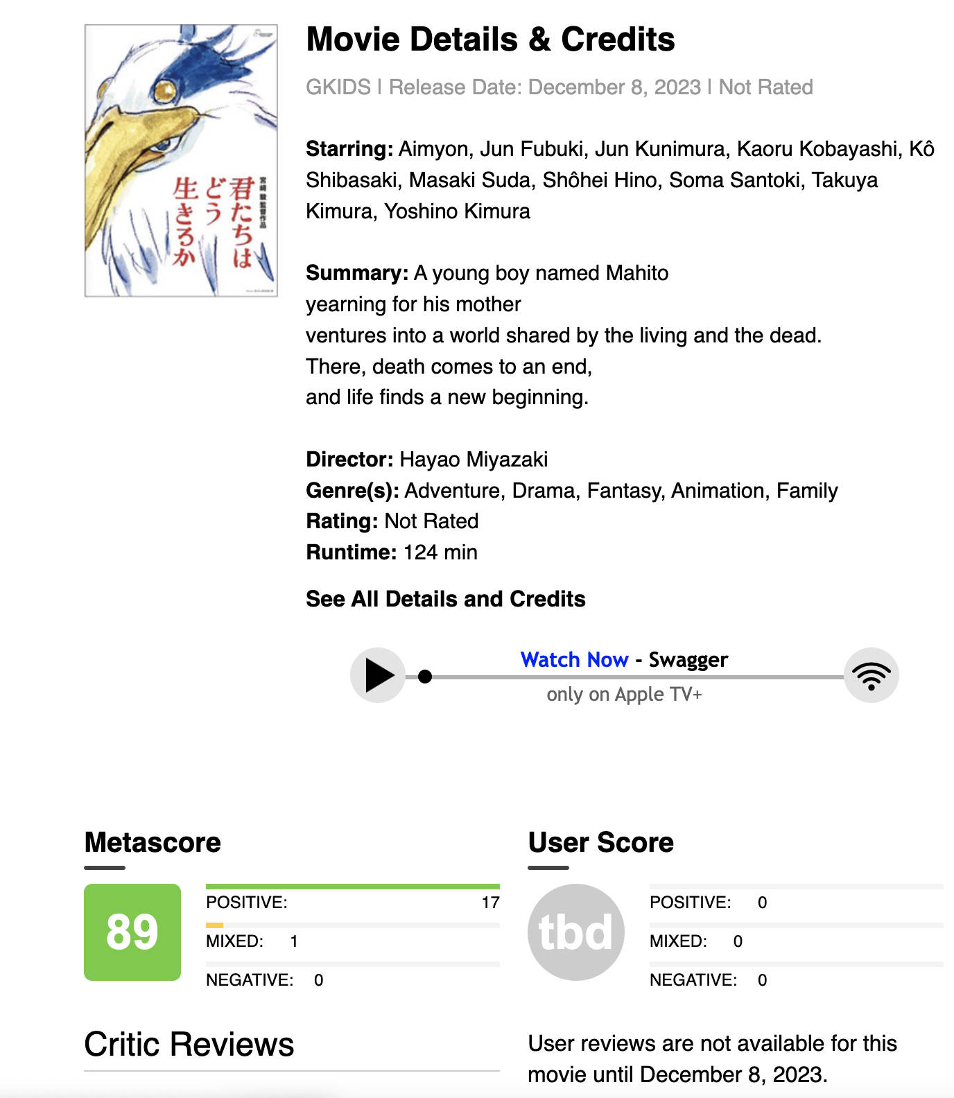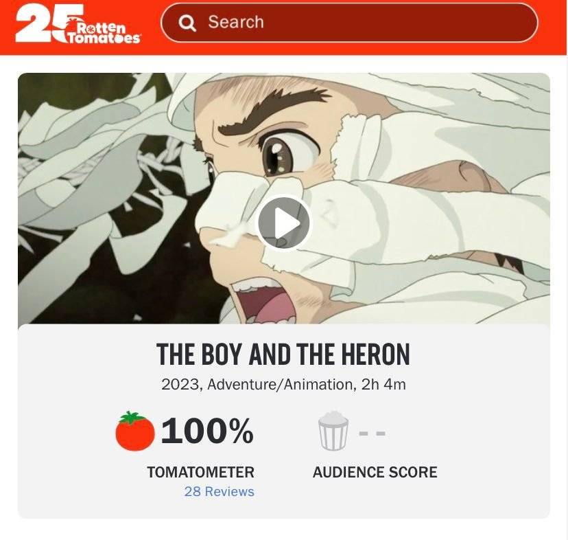 原标题:宫崎骏新作《你想活出怎样的人生》外媒口碑解禁 烂番茄100%MTC评分89大获好评