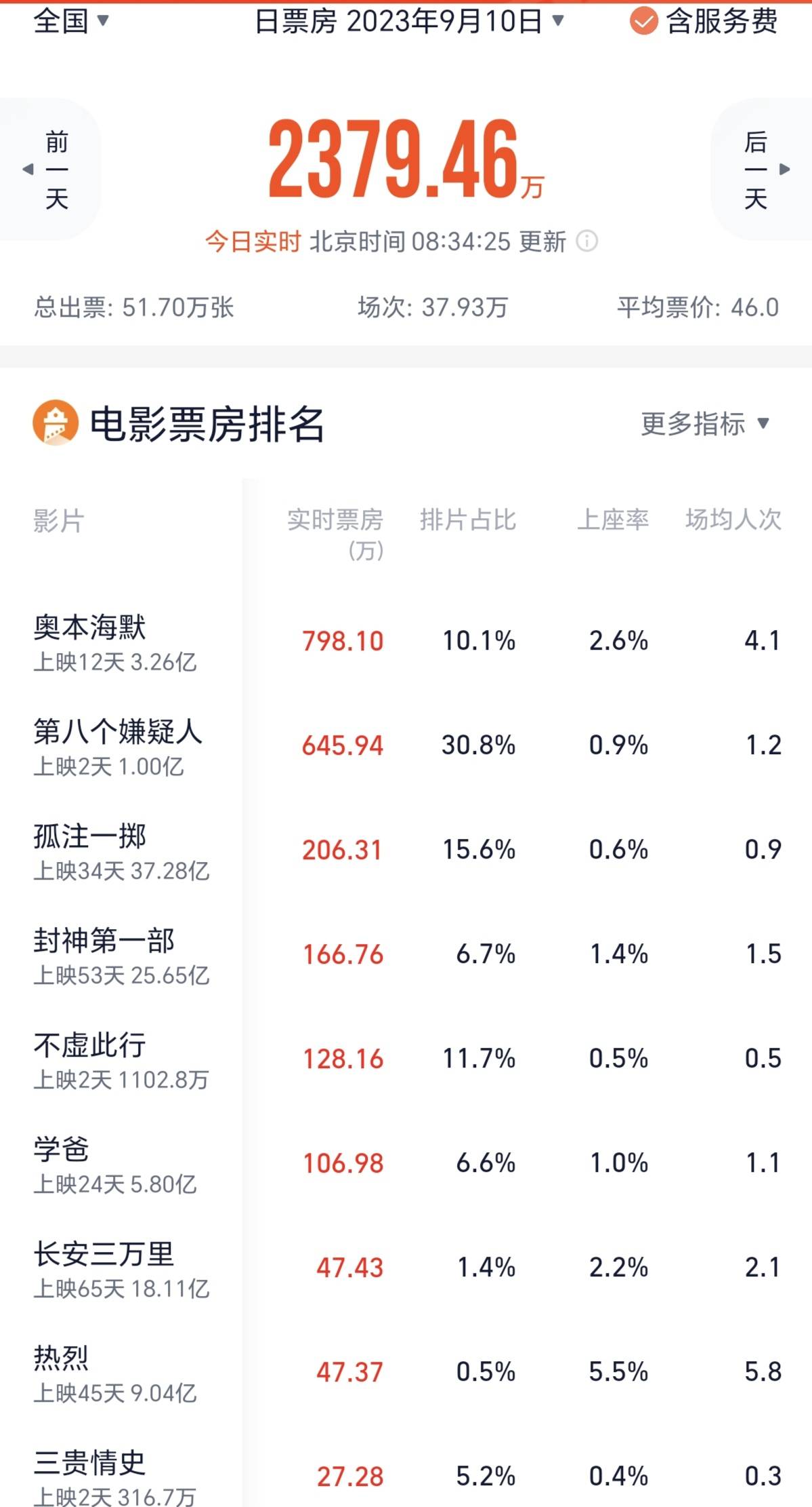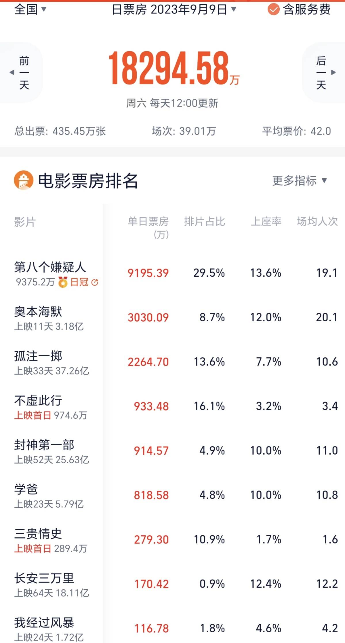 诺兰的《奥本海默》依旧强势,排片降到了8.7%,收票房3000多万元,上座率仅次于《第八个嫌疑人》,场均人次超过《第八个嫌疑人》,排第一。