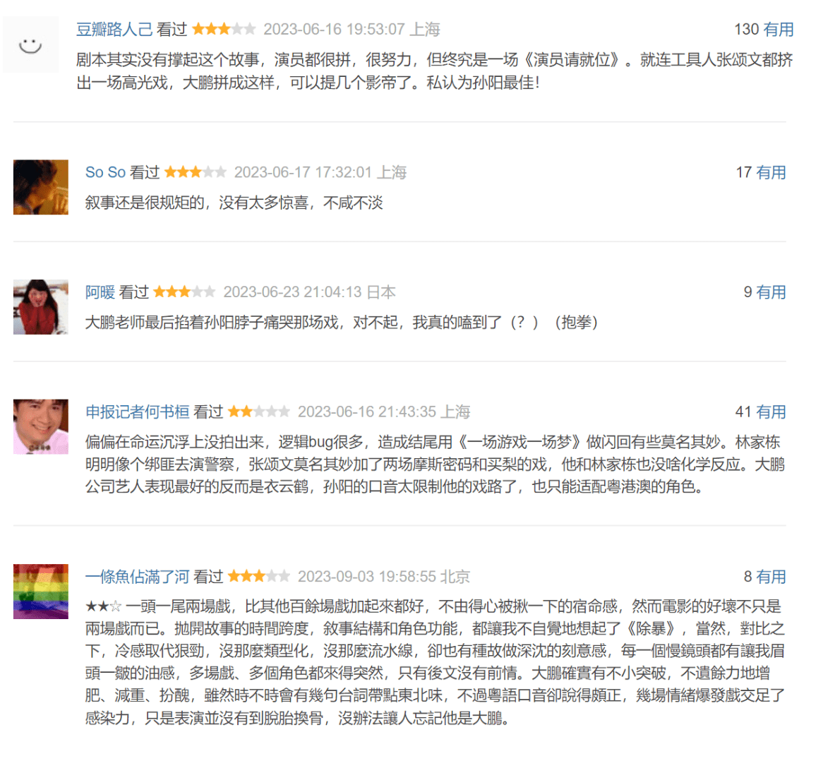 电影不乏收获四星好评,但也有一部分三星中评和两星差评。大家写的都很中肯,并直戳要害,比如一位得到高赞的观众写的是“剧本其实没有撑起这个故事,演员都很拼,很努力,但终究是一场《演员请就位》。就连工具人张颂文都挤出一场高光戏,大鹏拼成这样,可以提几个影帝了。私以为孙阳最佳。”这位观众给演员极高肯定,但不好意思,电影他只打出了三星,恐怕其中两星都是给演员的。