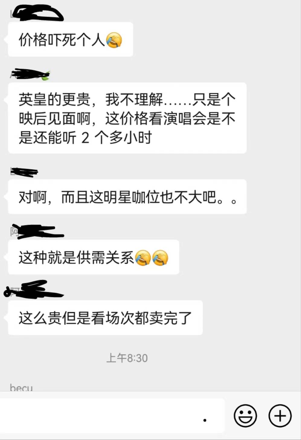 接着有影迷吐槽另一家有见面会的英皇影城更贵“我不理解……只是个映后见面啊,这价格看演唱会是不是还能听2个多小时。”另一位影迷则回应“对啊,而且这明星咖位也不大吧。”
