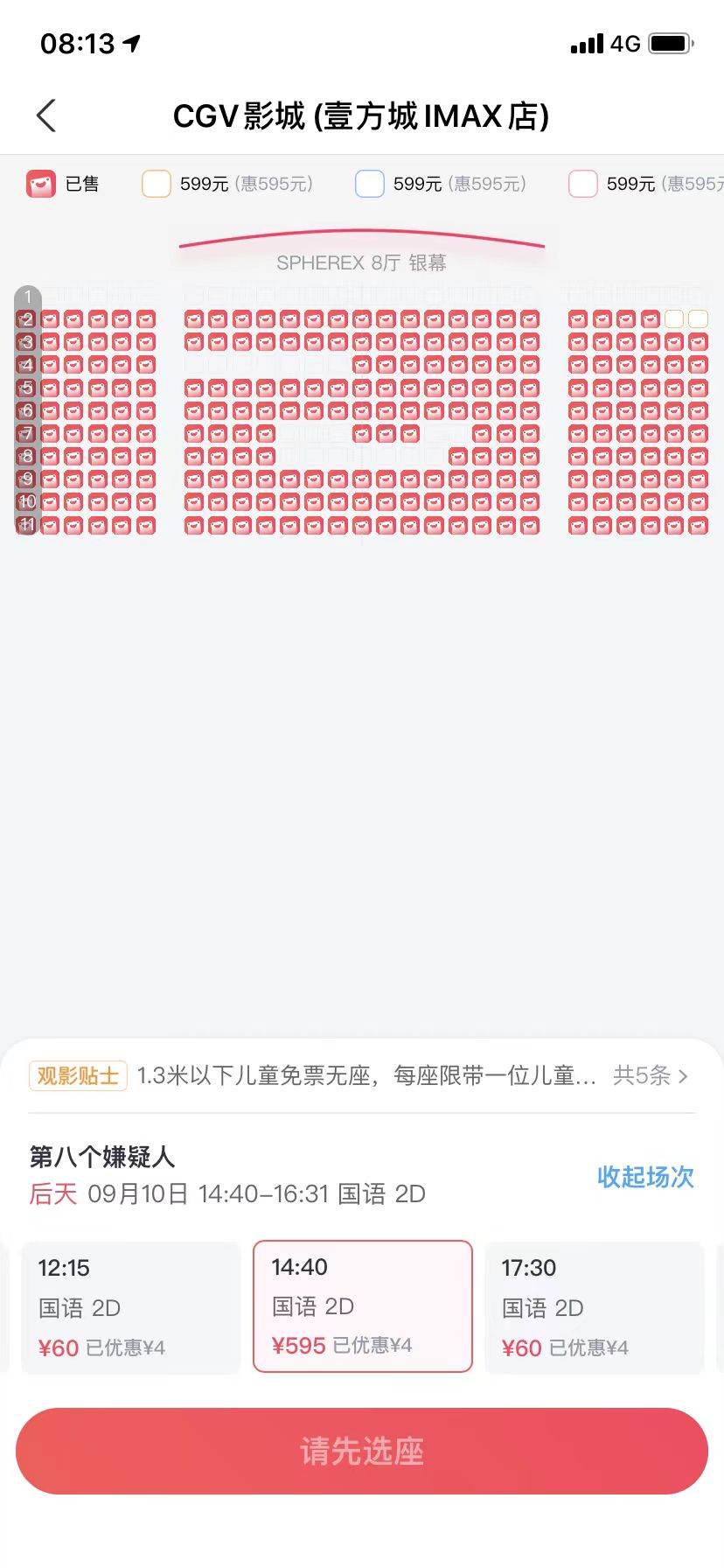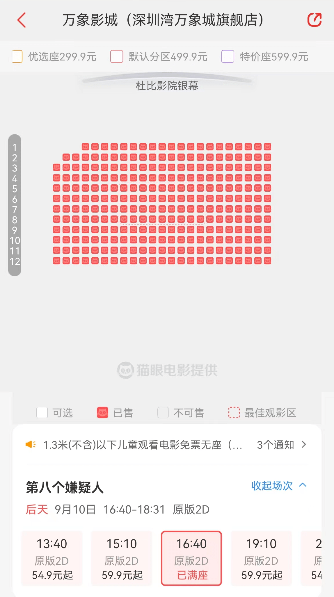 接着我们看了下另外两家有路演的影院,其中一家万象影城,将座位最多的杜比影院定为见面会的影厅,显示已经满座,其中原本观众会嫌弃的前两排“特价座”反倒成了能和明星近距离接触的“香饽饽”,所以价格也涨至599.9元,而此前属于看电影皇帝位的“优选座”因为比较靠后,反倒相对便宜,但也要近300元一张。