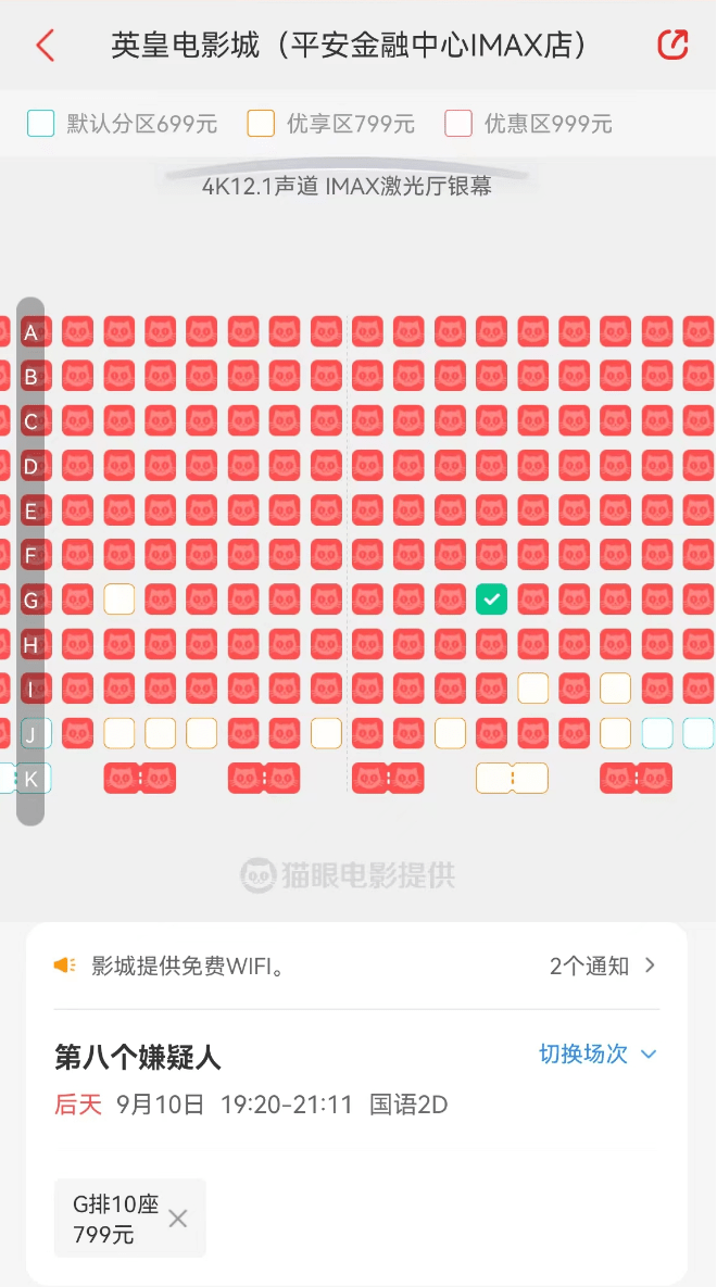 至于前文影迷提到的英皇,价格更加离谱,其中前两排的优惠区价格涨至千元!而最低(靠后)的价格也699元,我们看到尚有余票,随便选了个位置,显示价格799元。