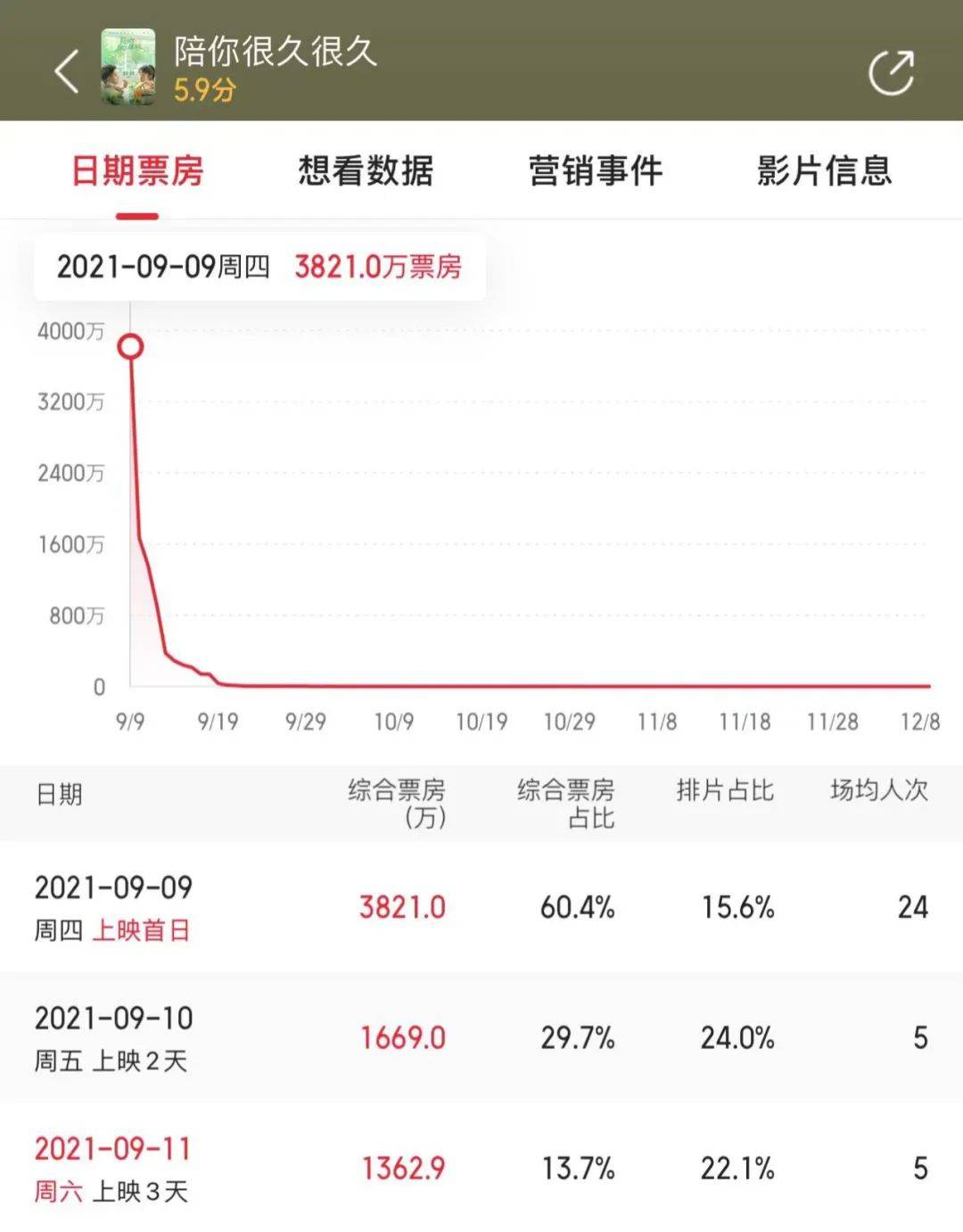 因此尽管《陪你很久很久》选在9月9日19点开片,在市场最为低迷的星期四工作日,又只有短短5个小时的上映时间,却成功撬动了3821万的票房成绩,空降当日票房日冠。