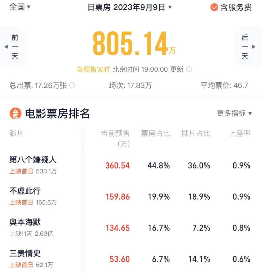 预售成绩方面也延续这一局面,截至9月6日19时,三部新片中成绩最好的《第八个嫌疑人》总预售票房不足700万,三部影片首日预售票房相加还不够1000万元。