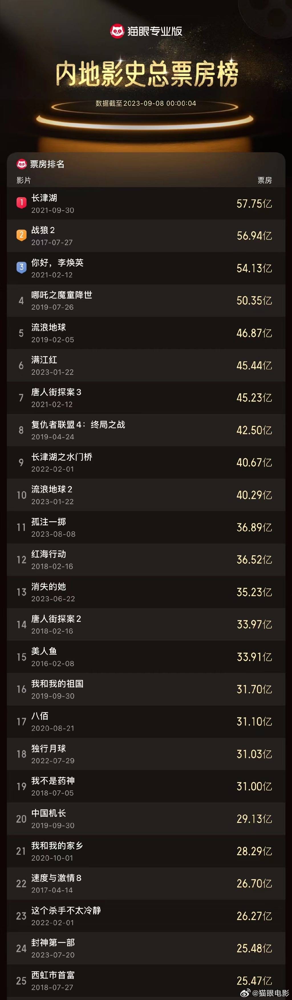 原标题:《封神》上映50天累计25.48亿 超《西虹市首富》跃居影史票房榜第24位