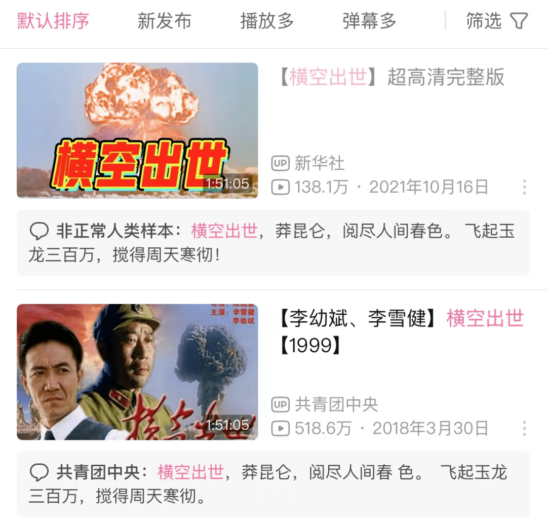 豆瓣上,很多人的留言和评价是在2017年、2018年留下的,那正是观众爱国情绪高涨的时候。B站上,共青团中央和新华社的账号分别在2018年和2021年上传了《横空出世》的原片,前者获得了500多万的播放量,后者也有130多万的播放。