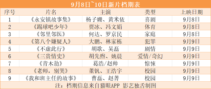 本周末(9月8日~9月10日)将陆续公映9部新片。我们按照市场眼光来看,拥有明星阵容或商业元素的新片显然更受关注。它们分别是:《永安镇故事集》《第八个嫌疑人》《不虚此行》《三贵情史》。