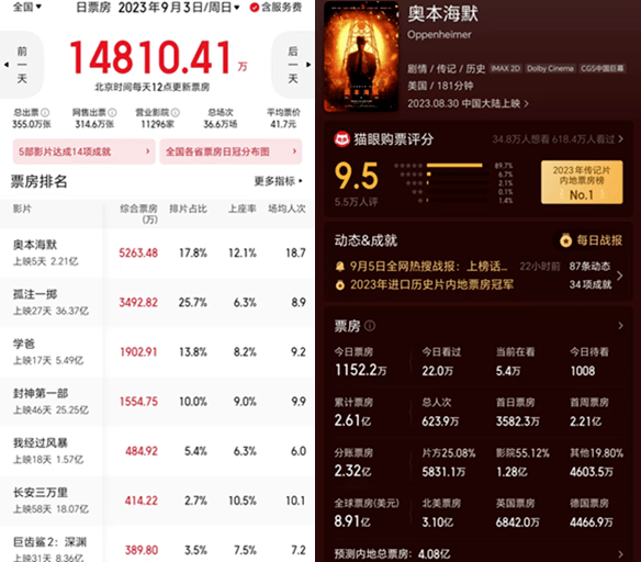《奥本海默》凭着好口碑,上映后逐渐走强,把大热国产片《孤注一掷》挤下了日冠位置,其预测总票房也从最初的2-3亿元提升到了4-5亿元。
