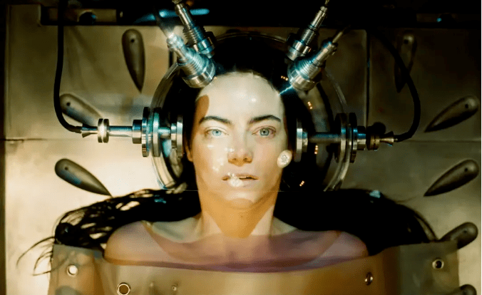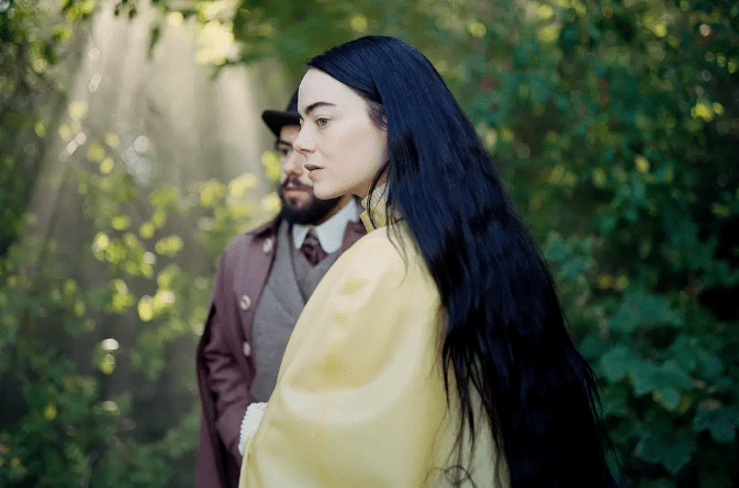 影片开场是艾玛-斯通的背影,她饰演的贝拉穿着一件令人惊艳的蓝色连衣裙,从桥上跳下自杀了。直到后来,这个女人的背景故事才逐渐浮出水面,这为贝拉拒绝男人对她占有和囚禁、强加给她严格的道德标准的动机,都增添了新的依据。